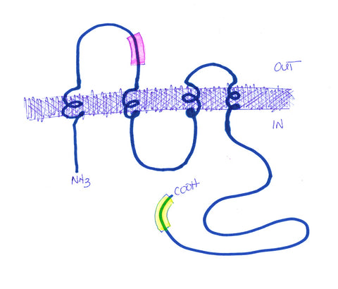 Dr. Eliana Scemes (Albert Einstein College of Medicine, NY) approached Aves Labs several years ago about making a Panx1-specific antibody (there are also Pannexins -2 and -3, which she did not want the antibody to recognize) that her lab could use for immunohistochemistry and other applications. She was interested in exploring the possibility that the paracrine functions of panx1 may underlie some important aspects of pain perception, and might ultimately serve as useful targets for production of novel analgesic drugs. Using our proprietary Immunogenicity Algorithm®, we identified 2 peptide sequences within the panx1 sequence that fit our criteria for immunogenicity (see Figure 1). From this list, Dr. Scemes chose a sequence near the N-terminus and within the first extracellular loop of panx1. After consultation with Dr. Scemes, we added a cysteine and a synthetic spacer amino acid to the N-terminus of this sequence, and synthesized the 13-mer peptide.