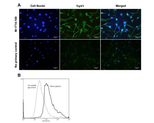 Our Anti-Capsaicin receptor (TrpV1) mouse monoclonal primary antibody detects guinea pig (predicted), mouse, and rat Capsaicin receptor (TrpV1), and is IgG. It is validated for use in FC, WB.