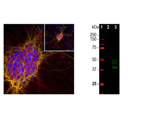 The antibody reacts with two bands at ~45 kDa and ~35 kDa which shows that the mouse anti-DCX antibody binds to an epitope in the region of DCX shared by Lis-A, and Lis-B, Lis-C and Lis-D, the C terminal 360 amino acids of Lis-A. It has also been used successfully for immunocytochemistry and is an excellent marker for developing neurons.