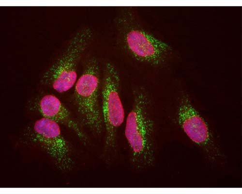 LAMP1 (Lysosomal Associated Membrane Protein 1, also known as CD107a, lysosomal associated membrane glycoprotein 1, LGP120 and LAMPA) is a protein primarily associated with the lysosomal membrane. In a typical cell LAMP1 is associated with spherical vesicles located next to the nucleus and the microtubule organizing center (1). LAMP1 is found on the cell surface of lymphocytes undergoing degranulation, a process in which cytoplasmic vesicles fuse with the plasma membrane, and this phenomena resulted in discovery of LAMP1 as a CD protein. The LAMP1 protein has a large N-terminal region which is inside the lysosome, hence topologically external to the cell, which is often referred to as the lumenal domain (2). The lumenal domain consists of two homologous globular segments separated by a proline rich sequence. Next there is a single membrane spanning domain and a short 11 amino acid C-terminal cytoplasmic tail. This tail region contains, at the extreme C-terminus, a so-called YXXI motif which is responsible for the sorting of the intact molecule to the endosome and lysozome, where Y = tyrosine, I = isoleucine and X = almost any amino acid (3). This motif is found in several other lysosomal proteins, where it functions in the same way. There are 417 amino acids in the human LAMP1 molecule, giving a native molecular weight of 44.8 kDa. However the N-terminal lumenal segment of LAMP1 is very heavily and variably glycosylated due to the presence of 18 N-linked glycosylation sites, so that on SDS-PAGE and on Western blots the protein runs as a diffuse band at 90-120 kDa. Antibodies to LAMP1 are therefore excellent markers of lysosomes in mammalian cells, though some LAMP1 may also be seen on late endosomes and on the plasma membrane.