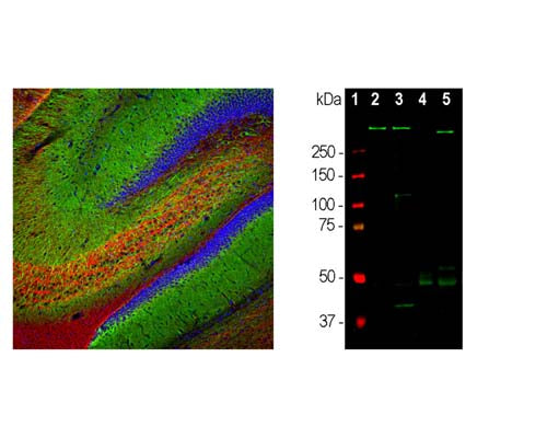 Whole rat brain lysate with mouse anti-MAP2 antibody. The antibody recognizes the ~280 kDa protein. Right: Mixed neuron/glia cultures stained with mouse anti-MAP2 (green) and also rabbit antibody to neurofilament H (Catalog Number R-1388-50) (red). Since the NF-H protein is largely expressed in neuronal axons, while the MAP2 is only found in neuronal dendrites and perikarya, there is little overlap between these two staining patterns. DNA stain shows nuclei of neurons and non-neuronal cells (blue).