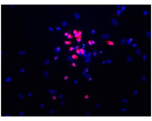 Image of a rat brain stem section by Immunofluorescence and Immunohistochemistry. The section was stained with M-377-50, Neuronal nuclei antigen [NeuN] /RNA binding protein fox-1 homolog 3 [FOX3], (NeuN/FOX3), Clone 1B7, Mouse mAb, (green), and co-stained with product C-1382-50, Microtubule associated protein (MAP2), Chicken pAb, (red), and DAPI staining of nuclear DNA (blue). Product M-377-100 selectively stains nuclei and the proximal cytoplasm of neuronal cells, while product C-1382-50 labels dendrites and overlaps with Fox3/NeuN staining in the perikarya of neurons. Method: following transcardial perfusion with 4% paraformaldehyde, the brain was post fixed for 24 hours, cut to 45 um sections, and free-floating sections were stained with the two antibodies.