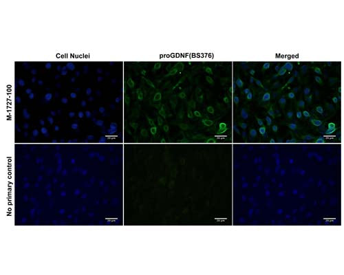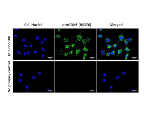 Our Anti-Pro-glial cell line-derived neurotrophic factor (proGDNF) mouse monoclonal primary antibody detects human, mouse (predicted), and rat Pro-glial cell line-derived neurotrophic factor (proGDNF), and is IgG. It is validated for use in FC, ICC.
