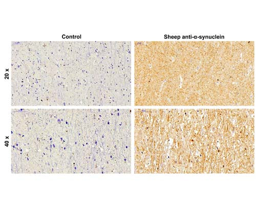 Our Anti-Alpha-synuclein sheep polyclonal primary antibody detects human, mouse, and rat Alpha-synuclein, and is affinity-purified. It is validated for use in ELISA, IHC-Frozen, IHC-Paraffin-embedded, WB.