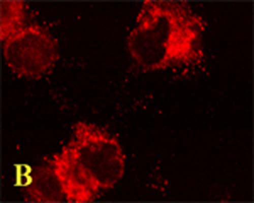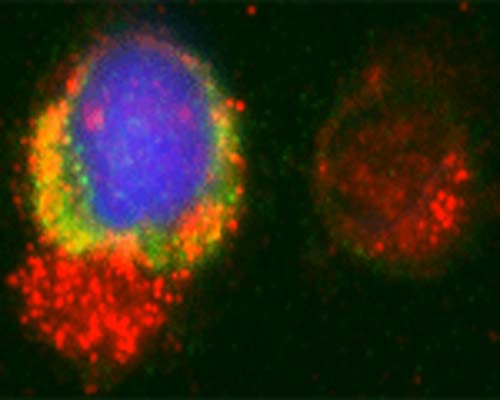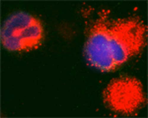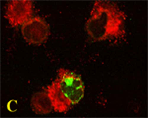Confocal microscopy on immunofluorescently detected MAP1LC3 A in cytospin-isolated human white blood cells using Rabbit antibody to MAP1LC3 A : whole serum (R-146-100) at a dilution of 1: 200, incubated for 1 h at room temperature. The cells were double-stained for MAP1LC3 A appearing in red and MHC class II appearing in. The cells were counter stained with Hoechst Dye (blue colour). Here, the merged picture is presented.