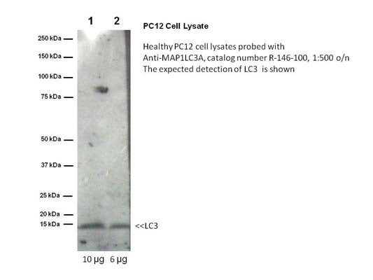 A synthetic peptide (RSFADRCKEVQQI) corresponding to the N-terminal of human MAP1LC3 A protein conjugated to Blue Carrier Protein has been used as the immunogen. The sequence is homologous with mouse and rat MAP1LC3 A.
