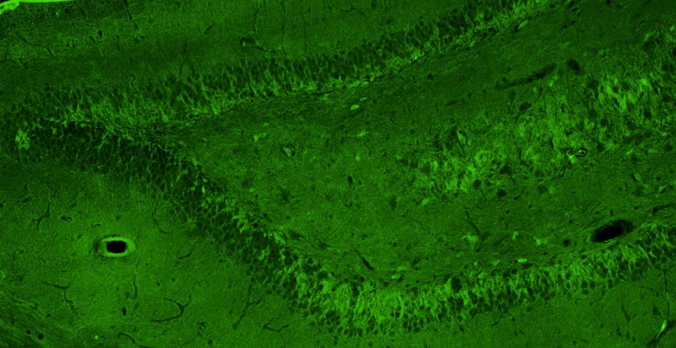 Representative section of formalin fixed, paraffin-embedded rat brain cerebellum showing cells stained by anti-GluN2A/NR2A Glutamate Receptor recombinant chicken mAb (green, Cat No. 78-288) using goat anti-chicken IgY CF®488 secondary antibody (Cat No. 80-1001-488). The stained sections were mounted with Antibodies Incorporated’s Fluoroshield with DAPI and DABCO mounting medium (Cat No. AR-6505). DAPI nuclear stain (blue) shows cell nuclei.