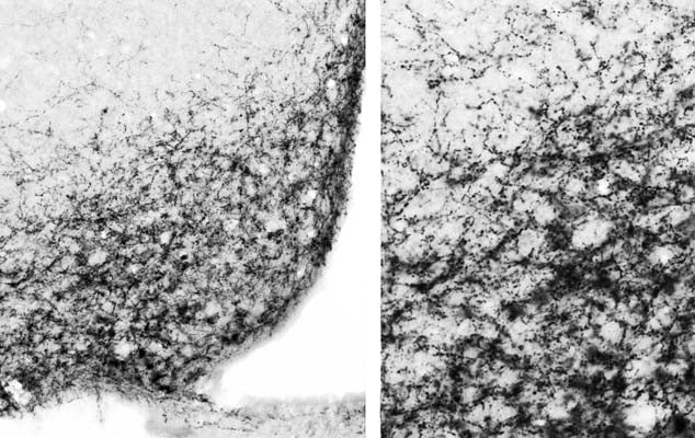 The 4% PFA fixed, frozen cryostat section of the sheep hypothalamus was incubated in guinea pig polyclonal antibodies to the mouse AGRP protein at the dilution of 1:1000 overnight followed by incubation with biotinylated secondary antibodies. Cell bodies and nerve terminals in the sheep brain are intensely stained. This figure shows staining of cells when no pre-absorption is performed.