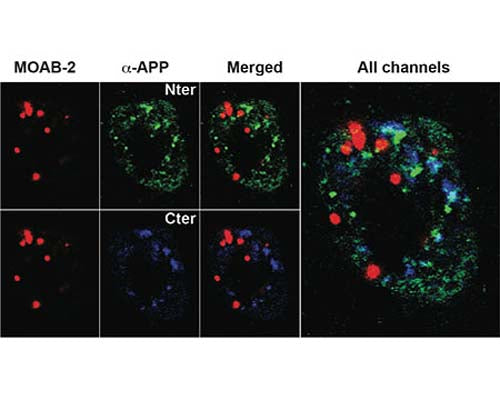 The antibody also reacts with archival formalin-fixed, paraffin-embedded tissue samples with antigen Heat Induced Epitope Retrieval (HIER): Recommended Citrate, pH 6.0 buffer for HIER. Signal was weak without antigen retrieval. Immunoreactively was expressed in intraneural-amyloid deposition (plaque) in Alzheimer's brain. MoAB-2 was found to be extremely clean and with an excellent signal to noise ratio with no neuro-cellular diffusive staining.