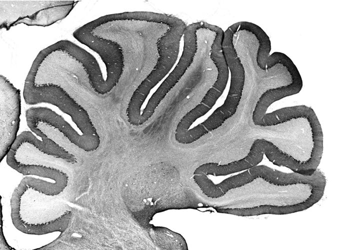 Representative image of formalin fixed paraffin embedded section of rat cerebellum section stained with anti-Teneurin-3 recombinant chicken monoclonal antibody (brown, Cat No. 78-532) and counterstained with hematoxylin (blue). Magnification: 200X