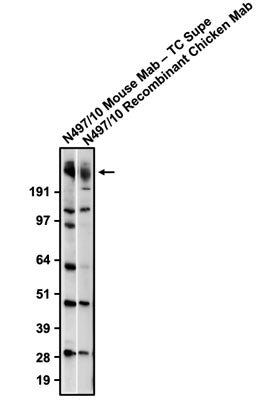 This recombinant antibody is a chimeric antibody created by replacing the mouse heavy and light constant regions clone N497/10 with chicken IgY heavy and light constant regions. As such this antibody retains the same binding performance as the original clone N497/10 but can be detected using standard anti-chicken secondary antibodies allowing flexibility for multiplexing applications. This antibody is expressed recombinantly in mammalian cells and then affinity purified from the cell culture media.