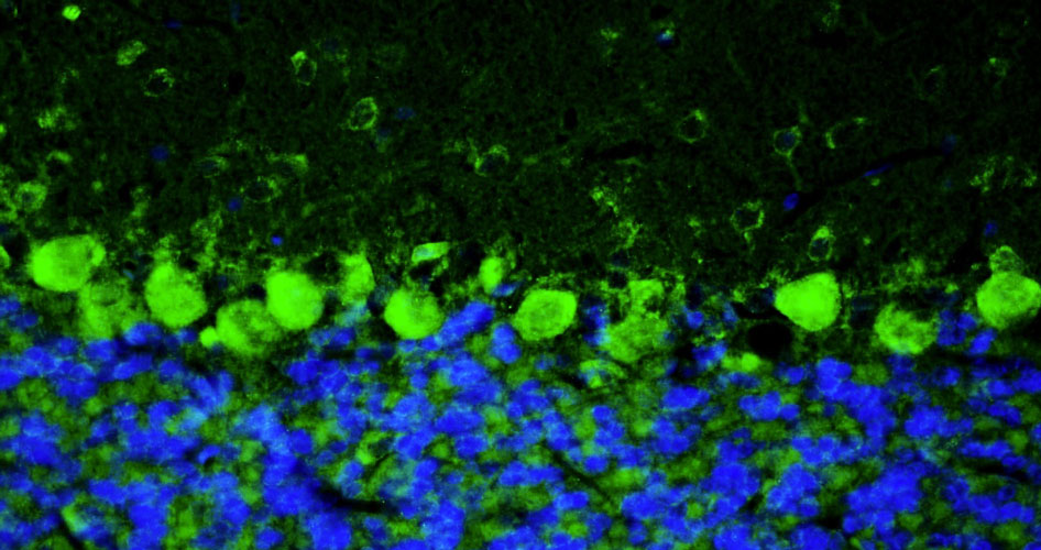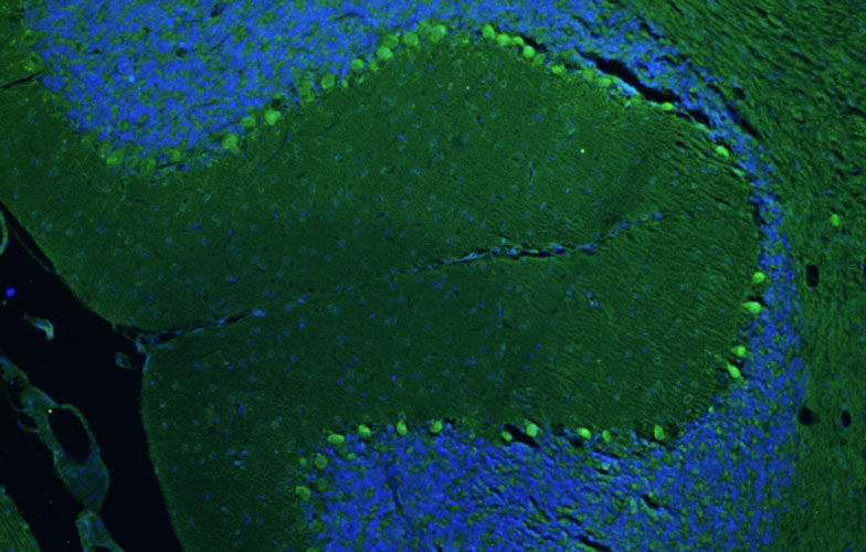 Immunohistochemistry for detection of TMEM240 in adult rat hippocampus using Aves Labs’ anti-TMEM240 recombinant chicken monoclonal antibody [N498/28] (Cat No. 78-533). Tissue was fixed with 4% paraformaldehyde and paraffin embedded. Heat induced antigen retrieval was performed using citrate buffer (Cat No. AR-6544) and then blocked with Immuno Protein Blocking Solution with Goat Serum (Cat No. AR-6591). The anti-TMEM240 antibody (Cat No. 78-533) was incubated with the sample at a dilution of 1:250 at 4C overnight. After washing with PBST, the sections were stained using goat anti-chicken IgY CF488 secondary antibody (Cat No. 80-1001-488) (green). DAPI nuclear stain (blue) shows cell nuclei.