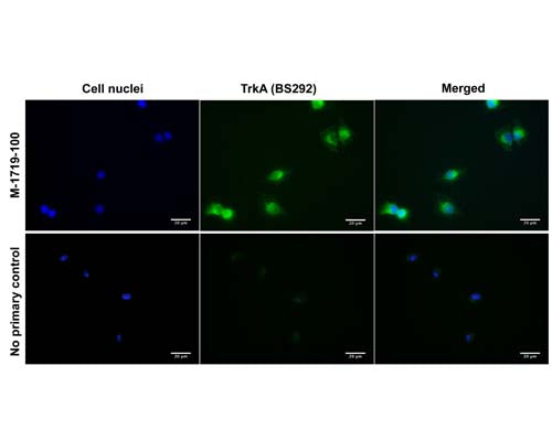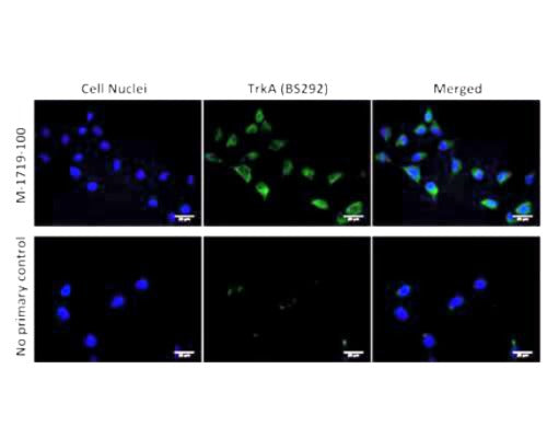 Our Anti-Tyrosine Kinase Receptor A (TrkA) mouse monoclonal primary antibody detects human, mouse, other mammals (predicted), and rat Tyrosine Kinase Receptor A (TrkA), and is IgG. It is validated for use in ICC, WB.