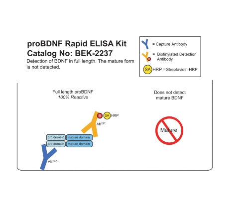 This ELISA kit consists of a pre-coated monoclonal anti-proBDNF capture antibody, a biotinylated anti-matureBDNF detection antibody and horseradish peroxidase (HRP)-conjugated streptavidin. The addition of a substrate (3,3',5,5'-tetramethylbenzidine, TMB) yields a colored reaction product which is directly proportional to the concentration of proBDNF present in samples and protein standards. A proBDNF positive control (QC sample) is provided to assure consistent assay performance.