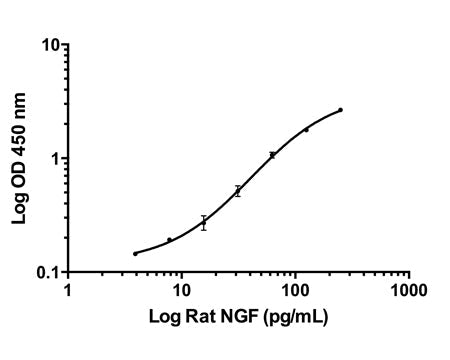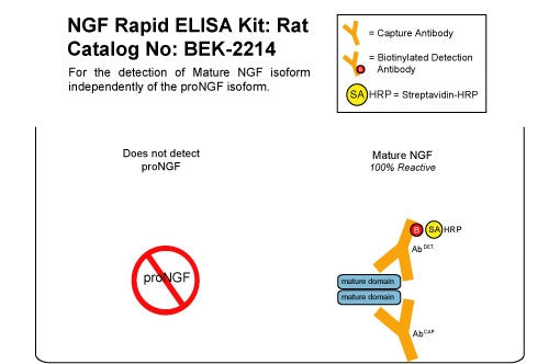 The Biosensis NGF Rapid enzyme-linked immunosorbent assay (ELISA) Kit is a sandwich ELISA that allows the quantification of rat NGF in less than 3 hours in cell culture supernatants, serum, and brain extracts. This NGF ELISA kit is designed to measure rat NGF and thus employs a recombinant rat NGF protein. Due to a high degree of NGF sequence homology, the antibodies used in this kit will also detect NGF from other species including human and mouse.
