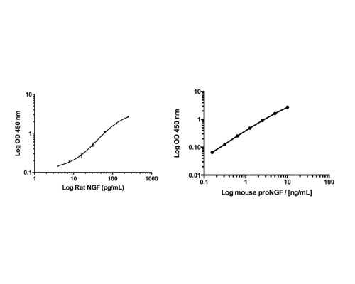 The ELISA kit box contains 2 x 96-well pre-coated strip plates per kit (1 x NGF antibody, 1 x proNGF antibody coated plate), protein standards, QC sample, detection reagents, heterophilic antibody blocker, wash and sample buffers, substrate buffer and detailed protocols.